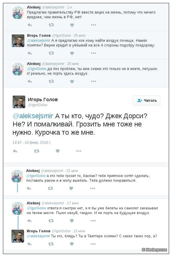 Много раз уже и отмечалось, и всерьез исследовалось, и по всякому-разному высмеивалось-вышучивалось… так что не сочтите за плагиат: но все ведь осталось по-прежнему, «дарагие панимаешь россияне», по достоинству оценив некоторые знаковые особенности виртуального общения на просторах Глобальной Сети — продолжают вволю упражняться здесь в наихудших качествах непризнанного своего гения. Что ж поделаешь. Не научили папа-мама в детстве очередного трусливого мудака Игоря Голова, живущего в Волгограде и привыкшего именовать себя на косноязычном английском — IGOR GOLOV Software Engineer in Волгоград, Россия — что немотивированную агрессию следует проявлять не в виртуальном пространстве, а, например… в спортзале, либо же, на худой конец, при встрече один на один и без свидетелей. Ну вот не читал человек в детстве «Трех мушкетеров», либо же начисто просрал и мозги и остатки приличий, мастурбируя перед экраном монитора. Случается в жизни такое, и нередко. Весьма забавно проследить диалектику умонастроения этого самого Игоря Голова из Волгограда: в первом реплике отчетливо имеет место быть оговорка «по Фрейду»… обратите внимание на твиты, чел вполне осознает, что пахнет рядом с ним явно нелучшим образом… далее он пробует по извечной нашей расейской привычке втупую хамануть совершенно незнакомому человеку, но моментально ломается и, как бы это поточнее сформулировать, дает взад, едва почувствовав, что сегодня не заладилось. Твиты приведены именно в той последовательности, в какой они «прозвучали», а незадачливый IGOR GOLOV Software Engineer in Волгоград, Россия — получает у нас премию: за беспримерное мужество, проявленное на просторах Глобальной Сети, и крайне показательный свой ура-патриотизм полуграмотного, даже пишущего с ошибками, дешевки-люмпена.